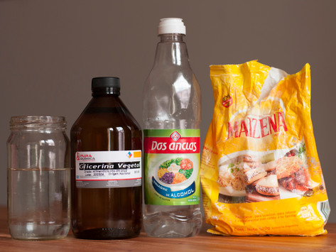 Ingredients for vegan bioplastic: (from left to right) water, vegetal glycerine, alcohol vinegar and cornstarch.